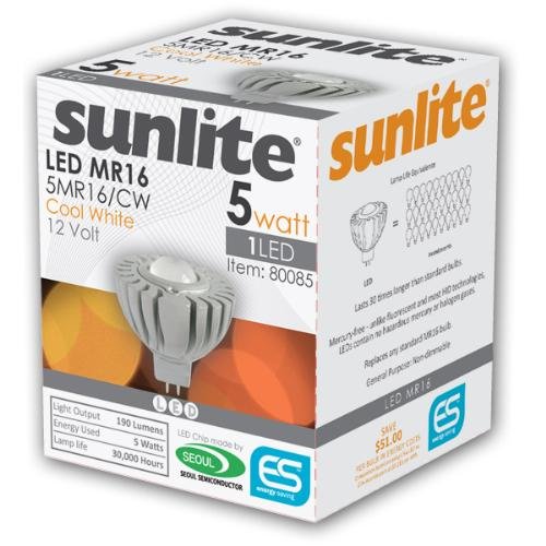FeaturesEnergy Star compliant.Bulb color enhances natural sunlight.compact design fits most fixturesNatural daylight balanced color.Long Life per regular use. 5MR16/CW COOL WHITE 1 LED 12V SUNLITE [ 12 PK ]?