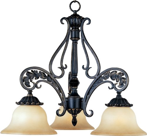 #The Maxim Lighting Bordeaux 3 Light Chandelier adds stately European details to interior decor in a well-balanced design that provides cheerful downlighting. The Bordeaux 3 Light Chandelier features a hand-painted finish with gold highlights, forged iron leaf details, and delicately-patterned glass shades. Maxim Lighting, headquartered in California, offers high-quality lighting fixtures in a variety of designs, finishes, and glass styles that complement contemporary and transitional interiors. The Maxim Lighting Bordeaux 3 Light Chandelier is available with the following: Included Features:Three Mocha Cloud glass shades.Metal body.Forged iron leaf details.Golden Noir finish.One ceiling canopy.120 in. field-adjustable chain.204 in. electrical wire.UL Listed. Lighting: Three 100 Watt 120 Volt Medium Base Incandescent lamps (not included). Shipping: This item usually ships within five business days. Dimensions Fixture: Height 21.5 In. Width 24 In. Chain: Length 120 In. Hanging Length: Overall Length Adjustable to 141.5 In.