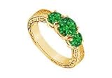 Emerald Three Stone Ring : 14K Yellow Gold - 0.75 CT TGW Size 5Three lush green round emeralds are prong-set in the center of the ring. The band is intricately designed in 14K yellow gold. This three stone ring has a total weight (TGW) of 0.75 ct...Please note: Normal shipping time is for the average ring size (Women - size 6, Men - size 10). If you order a different size, the ring will be custom made to that size and will take longer for shipping.......Please note: Normal shipping time is for the average ring size (Women - size 6, Men - size 10). If you order a different size, the ring will be custom made to that size and will take longer for shipping...